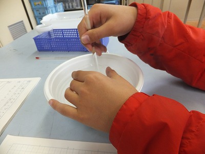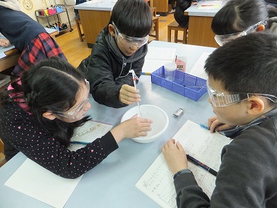 溶け残った食塩・ホウ酸を溶かすために水を増やしたり,温めたりして溶け方を調べました。保護メガネをし,水の量や温度をはかりながら実験しました。この実験で食塩とホウ酸の溶け方の違いに気付き,水の量や温度によって溶ける量が変わることが確かめられました。