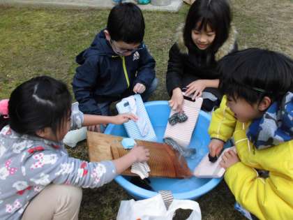社会で昔のくらしの学習をしました。今日は洗濯板とたらいを使った洗濯体験をしました。石鹸を使って洗濯板でくつしたを丁寧に洗っていきます。板の溝を使い、汚れを落としていきます。