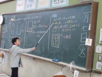 算数で小数の勉強に入りました。今日ははしたの数を分数ではなく、小数でも表すことができる、ということを習いました。また、小数点や10分の1の位についても勉強しました。