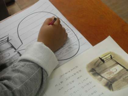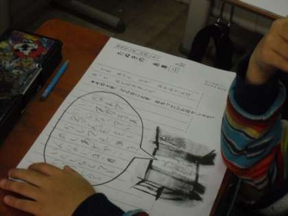 国語の「たぬきの糸車」の学習では,おかみさんやたぬきがどんなことを思っていたのかを考えながら,学習しています。「そのときどんなことを思ったか」を考えてワークシートに書いている様子です。