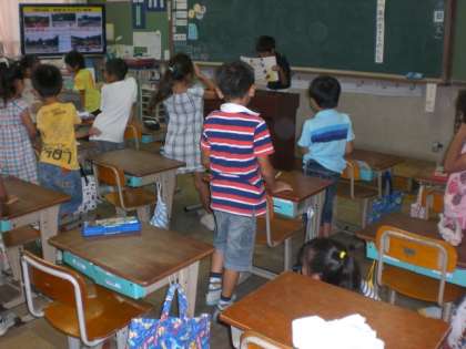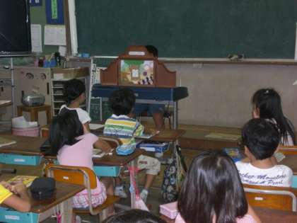 2年生に、紙芝居をしに行きました。2−1では、「ねこの体そう」、2−2では「いたずら忍者」です。「ねこの体そう」は、2−1のみんなにも一緒にしてもらいました。「いたずら忍者」は、絵の中の忍者を見つけてもらいました。2年生がとっても喜んで利いてくれて、たけのこの二人は、自慢げでした。