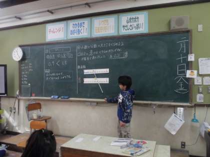 小数の勉強をしています。今日は、小数と分数の大きさの比べ方についての学習をしました。数直線を使うことや、0.1が何個分か、10分の1が何個分かで考えるやり方を覚えました。