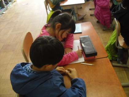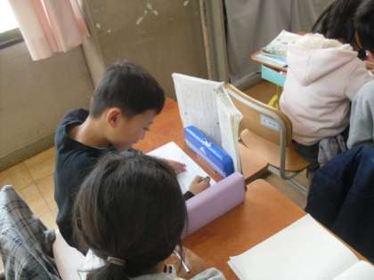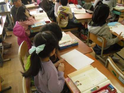 国語の「これはなんでしょう」は,二人で話し合い,問題を考えて,問題を出しあい,楽しむという学習です。今日は,二人で,問題を考えました。他の人に聞こえてしまうと問題を出しあう時に楽しめないので,となりどうしできるだけ小さい声で話し合いをしました。