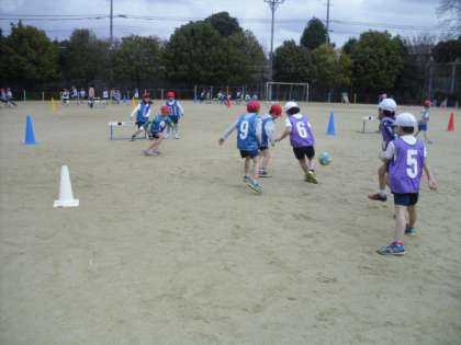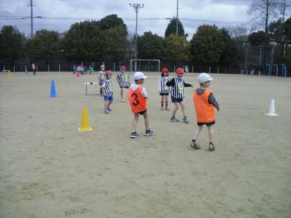 今日は,お天気も良かったので,予定通り「ボールけりゲーム」ができました。パスゲームの時とは,ちがうチームになったので,試しのゲームをしてみました。