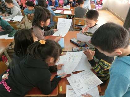 国語では,いろいろな種類の「おにごっこ」を1年生に伝えようというめあてで,子どもたちは文章を考えたり絵を描いたりしました。