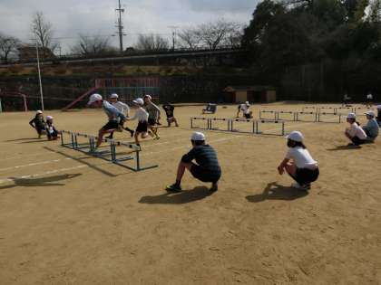 いよいよ1組もハードルに入りました。今日のめあては「トン、1,2,3」のリズムに乗ってまたぎこすことでした。先週のオリエンテーションで教えてもらったポイントをよく思い出してがんばっていました。1回目から目標タイムを超えた人がいっぱいでした。次回はインターバルも変えながら、記録に挑戦です!