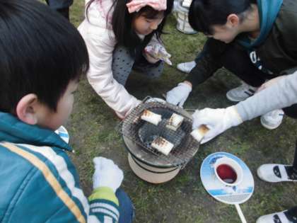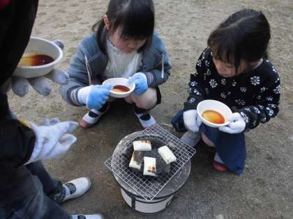 昔の暮らしの学習で,七輪の体験をしました。炭に火をつけるのにとても苦労していました。おもちを焼いておいしく食べました。良い体験になりました。