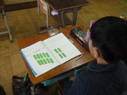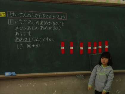 今日の算数は「100までのかずのけいさんのしかたをかんがえよう」というめあてでした。「40+30」や「70−20」の計算を,「10が4+3=7だから70です。」というように10のたばで考えました。
