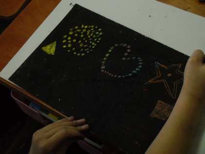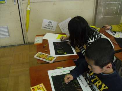 クレパスの明るい色を塗った上に,黒を重ねて塗った後,つまようじで削って絵を描きました。