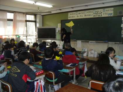 1時間目の算数の授業は新しい単元「円と多角形」の導入の部分でした。集中して折り紙で多角形を作る子どもたちの姿を参観していただきました。
