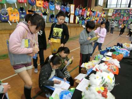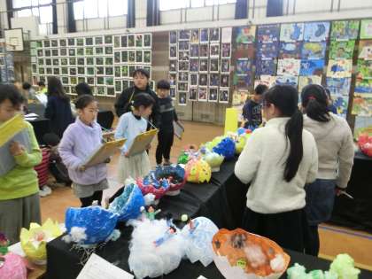 体育館で行われている造形展に行きました。4年生が展示していた「ぱっくりたまご」のコーナーでは,友達の作品で工夫されているところやいいなと思うところを見付けました。「このアイディア,面白いな。」「こんなに細かいパーツ,どうやって作ったんだろう?」とたくさんの気づきがあったようです。