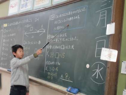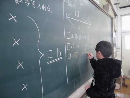 算数で「□を使った式」の学習をしています。今日は□の数字を求める方法の勉強をしました。□にいろいろな数字を入れて考える仕方と,図にかいて考える仕方を学びました。