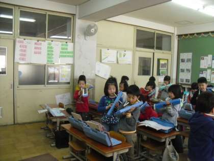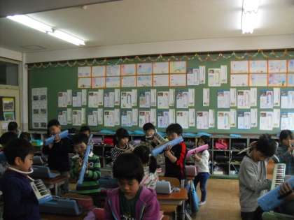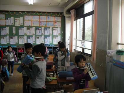 今日の音楽の時間は,入学式のお迎えの言葉の時に演奏する「きらきらぼし」の練習を中心にしました。立って演奏することになるので,その練習もしました。