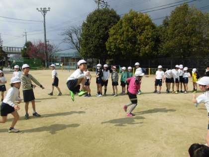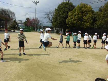 体育で「大縄跳び」「キックベース」をしました。楽しくがんばりました。