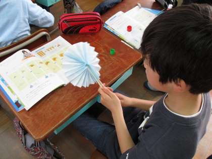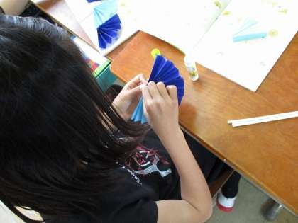 今日は折り紙と割りばしを使って丸く開くおうぎを作りました。