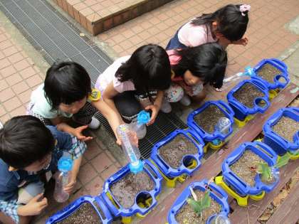 生活科の学習で,「あさがおのたねまき」をしました。小さな種をよく見て観察した後,ピカピカの植木鉢に一人6つの種を植えました。ふかふかの土の布団をかけて,たっぷりお水をやりました。明日から毎日お世話をがんばります。