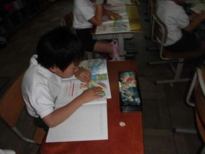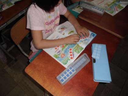 今日の算数では,教科書に載っている魚の長さを数図ブロックを並べて調べた後,「1cm」について学びました。