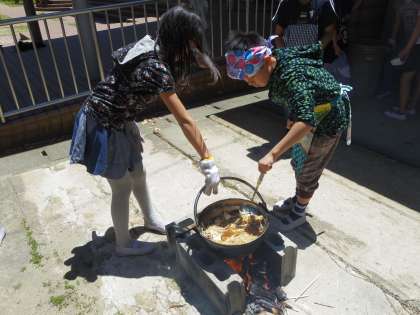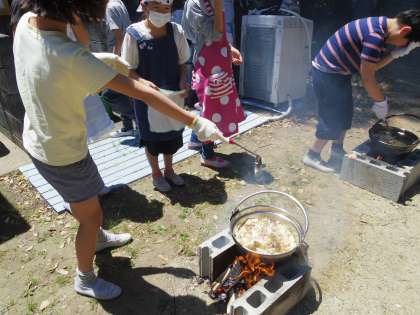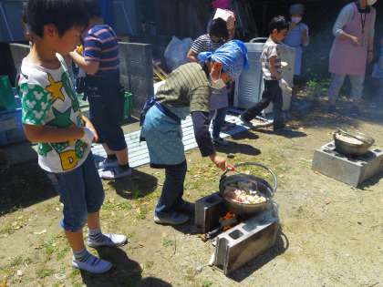 調理班が下ごしらえをした具材を鍋をかまどで煮ているところです。煮えすぎないように調節しながらつくっていこう。煙が目にしみて涙がぽろぽろでてる子もいるけど一生懸命取り組んでいます。