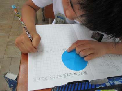 円を折ったりする子,定規で長さを測る子など,さまざまな考えが出ました。