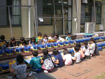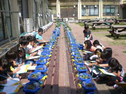 今日の5時間目は,国語でしたが,アサガオの芽が出て,本葉が出始めたので,変更してアサガオの観察をしました。中庭に行き,よく見て,絵を描いた後,言葉で様子を書きました。