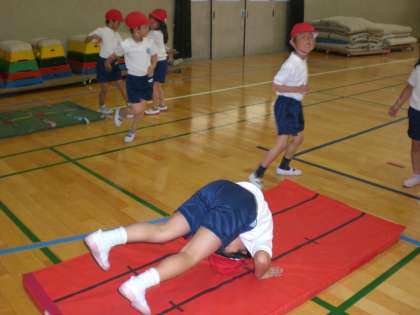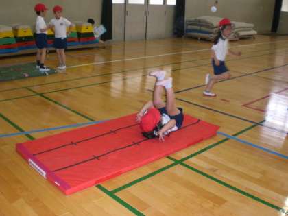 今日の学習では,後ろ回りの中心に練習しました。坂をつけて回れるようになったら,平らなマットでやってみるようにしました。回った後,しっかり足の裏をついて起き上れる子が増えてきました。