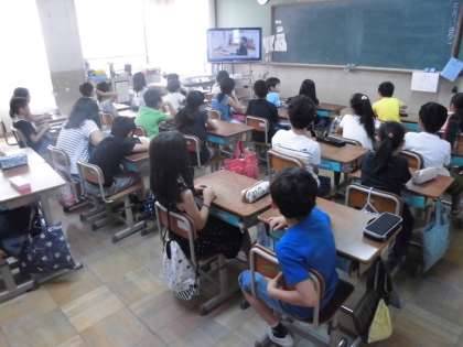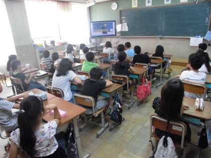 たけのこ学級のお友達が普段はどんな勉強をしているのかをビデオを通して観ました。4年生の交流をしているお友達の姿も映っていて、みんなが注目していました。