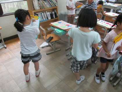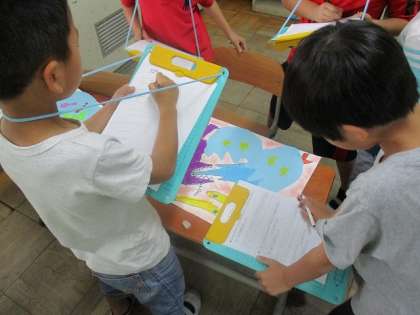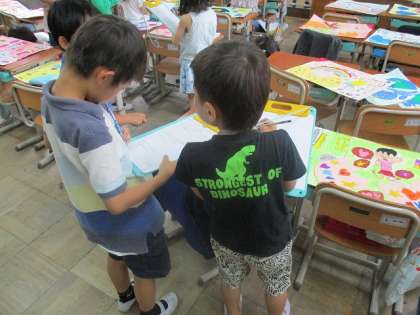 他の子どもの絵を見て、良いところを紙に書いていました。