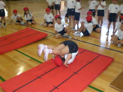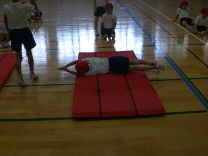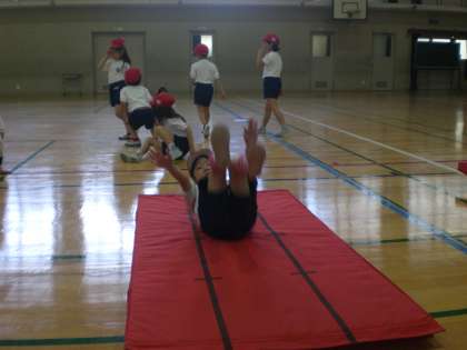 今日のマット運動では,後ろ回り→前回り→横回りの順に練習しました。後ろ回りは,坂をつけずに,足の裏で立てるように上手に回れる子がまた増えてきました。前回りも着地の時に,腕を前にまっすぐのばし回れる子も増えました。