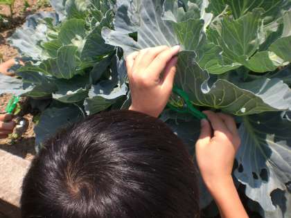 キャベツの葉にもんしろちょうがたくさん卵を生んでいました。2mmくらいの小さな幼虫や結構大きく育った2cmくらいの幼虫もいました。子供たちは虫眼鏡で観察していました。