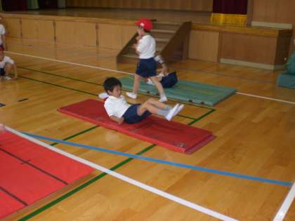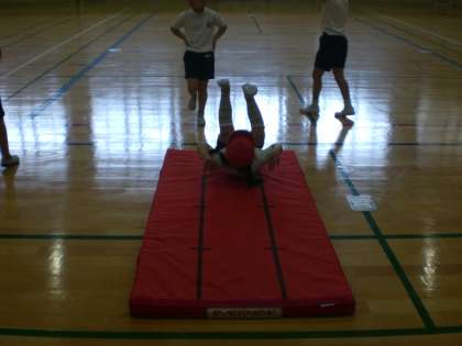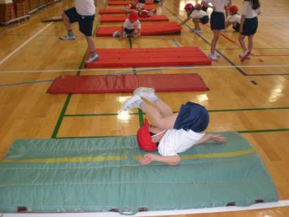 今日は,坂をつけるだけでなく,マットの下に長椅子をおいたり,幅の狭いマットを使ったりしました。授業の最後には,前回りと後ろ回りがどれだけできるか一人ずつテストのような形でやってみました。