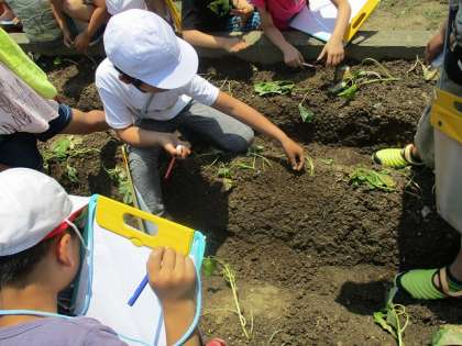 今日は金曜日に植えたサツマイモの観察をしました。