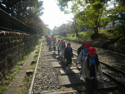 紅葉がきれいでした。子どもたちはとても楽しそうに、線路の上を歩いていました。
