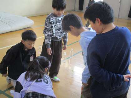 エコ容器で作った走る車や飛ぶ・進むおもちゃ、磁石を使ったおもちゃのグループに分かれて遊んでもらいました。「おもしろかったよ。」と1年生の声を聞いて、2年生も大満足。楽しい1時間となりました。