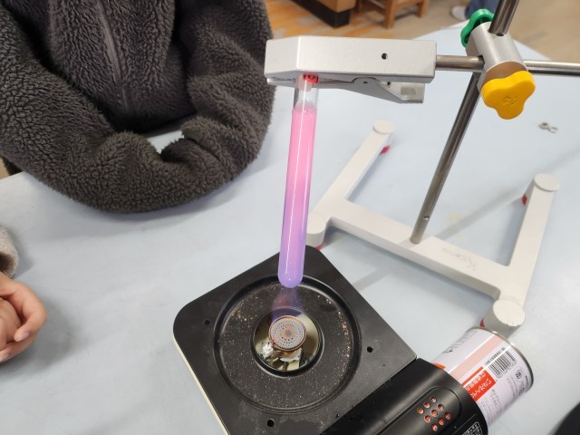ブルーの水が、だんだんピンク色に変わっていく様子を観察しました。