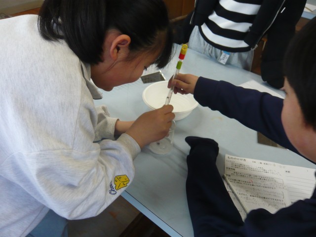 理科の授業では、食塩や砂糖など、ものが水にどのように溶けるのかを実験を通して学んでいます。