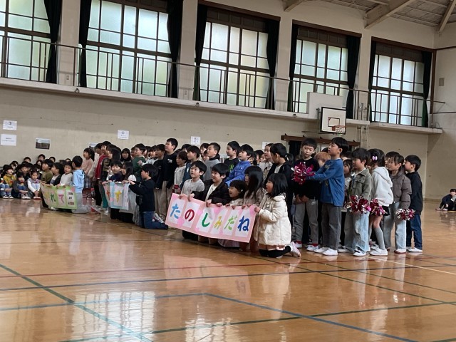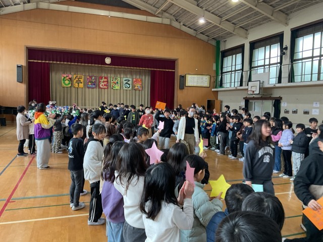 全校で「6年生を送る会」を行いました。1年生から5年生までの子どもたちは、この日のために歌やダンス、感謝の言葉を心を込めて準備し、6年生への思いがあふれる素晴らしい出し物を披露しました。6年生からは「旅立ちの日に」の合唱があり、力強く美しい歌声が体育館いっぱいに広がりました。