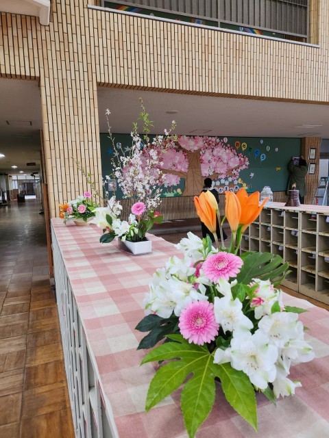 「昇降口のお花」や「サクラソウ」も祝福してくれています!!
