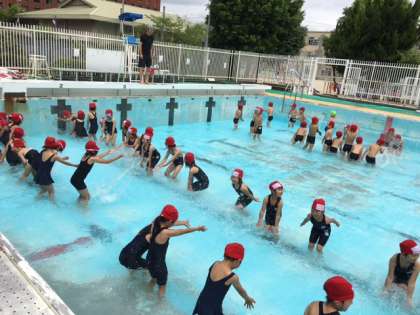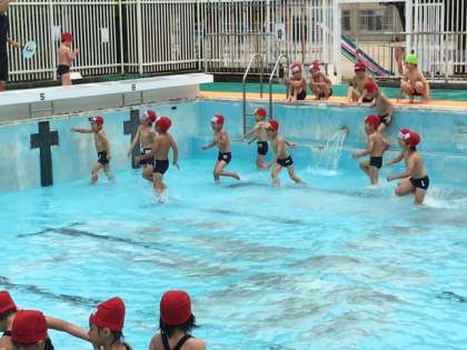 小学校のプールにはじめて入る子どもたちは,大きいことにびっくりしていました。