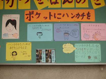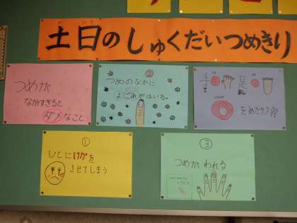 そこで,今年度全校で取り組んでいる「土日の宿題 つめきり」と「ポケットにハンカチを」を呼びかける掲示物を作成しました。