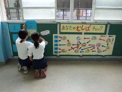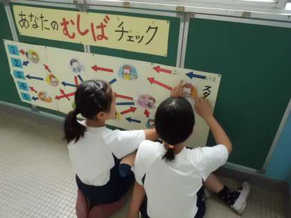 そこで保健室前掲示板では,自分の歯の様子をチェックできる質問形式にしました。
