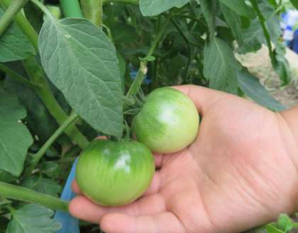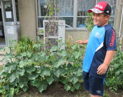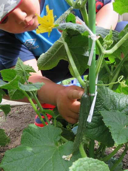 わかば畑のトマトときゅうりがお日さまの恵みを受けて,ぐんぐん成長しています。お腹ぐらいまでつるも伸びています。たくさんの実もつけ始め,「だれが一番に食べる!?」…と,すでに子どもたちは食べるときのことを相談しています。
