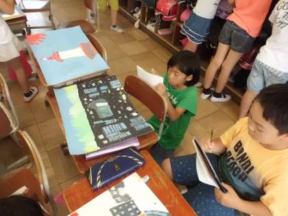 3年生は,京都タワーと鉄道博物館に行った遠足の思い出を絵に表しています。今日はその絵を机に置いて,「3−1図工展」と称して鑑賞しました。鑑賞では「きれいです」「うまいです」のような曖昧な言葉ではなく,「何が」「どのように」を明確に,具体的に書くことを心がけました。