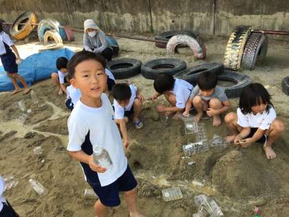 今日は、グランドで土遊びをしました。まずは、ペットボトルに水を入れて、グランドに大きな○をかいたり、キャラクターの絵をかいてみたりしました。