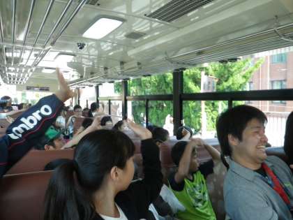 バスの中でゲームをして盛り上がっています。