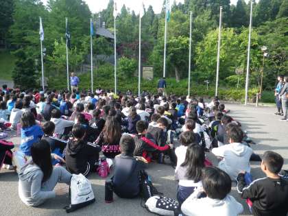 朝の集いでは、砂川小のほかに、納所小、西京極西小、伏見板橋小と合同で行い、各校の代表が学校紹介をしました。