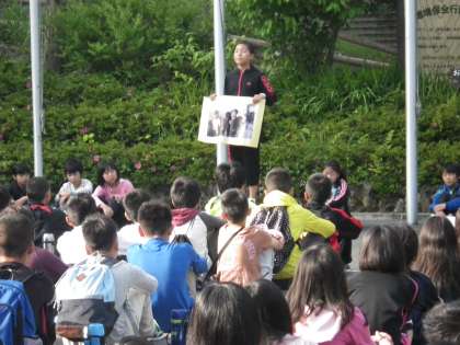 砂川小の紹介は、スマイル活動をしている写真や学校目標を見せながら、たくさんの人の前で堂々とすることができました。