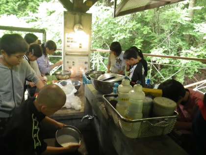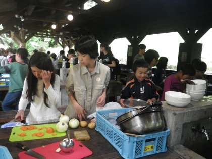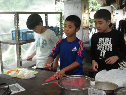 野菜も肉もみんなで協力して切っています。