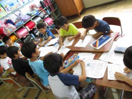 グループに分かれて,質問を考えたり,練習をしたりしています。