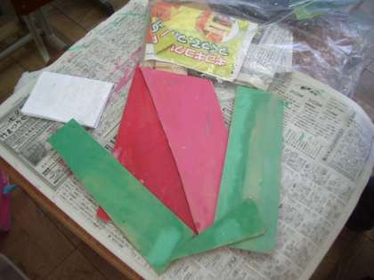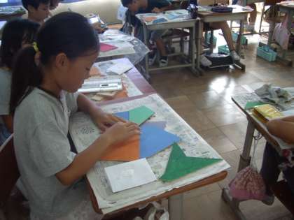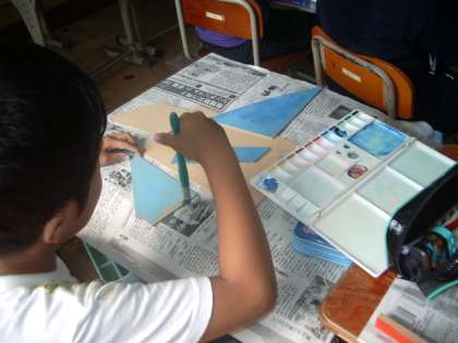 のこぎりで切った,いろいろな形の板を組み合わせて,動物や花の形を作っていきます。丁寧に彩色したり,木工用ボンドで板を貼り合わせたりしているところです。