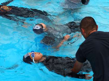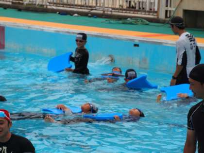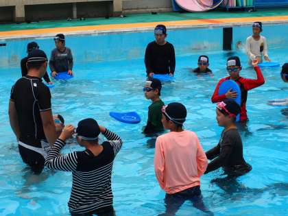 今日は講師として消防士の方をお招きし,着衣泳の授業を行いました。水辺でもしものことがあったとき,どのようにして命を守るのかという話を聞き,実際に浮く練習をしました。